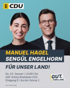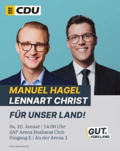 der Wahlkampf geht in seine entscheidende Phase – jetzt kommt es auf persönlichen Austausch, Zusammenhalt und gemeinsame Überzeugungen an. Umso mehr freuen wir uns, Sie ganz herzlich zu einer besonderen Veranstaltung nach Mannheim einzuladen. Der Fraktionsvorsitzende der CDU-Landtagsfraktion Baden-Württemberg und Spitzenkandidat der CDU Baden-Württemberg, Manuel Hagel, kommt nach Mannheim. Gemeinsam mit Ihm und Ihnen möchten wir darüber sprechen, wie wir Baden-Württemberg und unsere Stadt Mannheim stark, sicher und zukunftsfähig gestalten können.